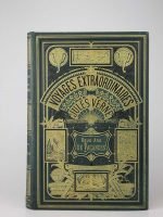 Jules Verne : Deux ans de vacances. Paris, Hetzel, sd (1877, catalogue d'une page in fine). Un volume grand in-8° relié pleine percaline d'éditeur à décor, cartonnage aux deux éléphants sur fond vert. Bel intérieur sans rousseurs. Corps d’ouvrage un peu gauchi. Quelques marques du temps. Le cartonnage est très frais. Bel exemplaire de premier tirage.