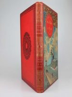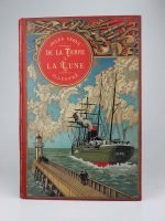 Jules Verne : De la terre à la lune. Paris, Hetzel, sd, (1894, catalogue HF). Un volume grand in-8° relié pleine percaline d'éditeur à décor, cartonnage au steamer, titre dans un macaron rouge. Quelques rousseurs dans un intérieur frais. Usure aux coiffes.  Le cartonnage est très frais. Quelques marques du temps. Bel exemplaire.