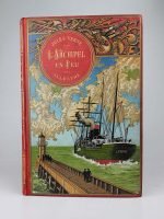 Jules Verne : L'archipel en feu. Paris, Hetzel, sd, (après 1900). Un volume grand in-8° relié pleine percaline d'éditeur à décor, cartonnage au steamer, titre dans un macaron rouge. Restaurations intérieures et extérieures de qualité moyenne, gardes fendues. Cartonnage plutôt frais. Bon exemplaire.