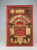 Jules Verne : Le secret de Wilhelm Storitz & Hier et demain. Paris, Hetzel, sd (1910). Un volume grand in-8° relié pleine percaline d'éditeur à décor, cartonnage à l'éléphant avec le titre dans l'éventail, dos au phare. Bel intérieur, Quelques marques du temps, auréoles, traces et petits frottés au dos. Le cartonnage est très frais. Bon exemplaire de premier tirage.