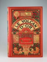 Jules Verne : Le volcan d'or. Paris, Hetzel, sd (1906). Un volume grand in-8° relié pleine percaline d'éditeur à décor, cartonnage à l'éléphant avec le titre dans l'éventail, dos au phare. Très bel intérieur très frais, le cartonnage également. Fer doré au second plat du patronage du sixième arrondissement. Magnifique exemplaire de premier tirage!