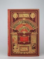 Jules Verne : Les Indes noires & Le Chancellor. Paris, Hetzel, sd (1883, catalogue BR). Un volume grand in-8° relié pleine percaline d’éditeur à décor, cartonnage aux deux éléphants sur fond rouge. Quelques rousseurs, l'intérieur étant toujours de premier tirage. Quelques marques du temps. Bel exemplaire.