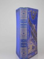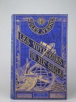 Jules Verne : Les voyageurs du XIXème siècle. Paris, Hetzel, sd (vers 1880, catalogue AI). Un volume grand in-8° relié pleine percaline d’éditeur à décor, cartonnage à la sphère armillaire copernicienne sur fond fond bleu. Quelques rousseurs. Le cartonnage est très frais mais un peu gondolé et la toile décollée au coin supérieur droit sans que sa structure en aie souffert. Bel exemplaire de premier tirage.