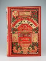 Jules Verne : Michel Strogoff. Paris, Hetzel, sd (Après 1905). Un volume grand in-8° relié pleine percaline d'éditeur à décor, cartonnage à l'éléphant avec le titre dans l'éventail, dos au phare. Quelques rousseurs et marques du temps, quelques ressauts en gouttière. Cartonnage frais. Bel exemplaire.