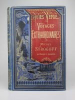 Jules Verne : Michel Strogoff. Paris, Hetzel, sd, (1876, collection. Catalogue N°2). Un volume grand in-8° relié pleine percaline d'éditeur à décor, cartonnage à la bannière, écusson brique sur fond bleu. Restauration malhabile des ors du dos. Le reste de l'ouvrage n'a pas été touché. Rousseurs assez présentes, mais vraiment sans excès pour la période. A part le dos, bon exemplaire de premier tirage.