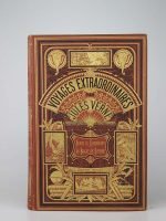 Robur le conquérant & Le billet de loterie. Paris, Hetzel, 1886, catalogue DF. Un volume grand in-8° relié pleine percaline d'éditeur à décor, cartonnage aux deux éléphants sur fond havane. Quelques rousseurs, plus présentes en début d'ouvrage. Rares marques du temps. Très bel exemplaire de premier tirage.